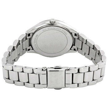 Stainless steel case with a stainless steel bracelet set with crystals. Fixed stainless steel bezel set with crystals. Mother of pearl dial with silver-tone hands and alternating Roman numeral and index hour markers. Dial Type: Analog. Miyota caliber GL30 quartz movement. Scratch resistant mineral crystal. Pull / push crown. Solid case back. Round case shape. Case size: 33 mm. Case thickness: 7 mm. Band width: 16 mm. Fold over clasp with a safety release. Water resistant at 50 meters / 165 feet. Functions: hour, minute, second. Casual watch style. Watch label: Japan Movt. Michael Kors Lauryn Crystal Mother of Pearl Dial Ladies Watch MK3900.