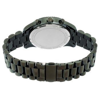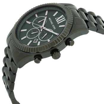 Green stainless steel case and bracelet. Fixed green stainless steel bezel. Green dial with silver-tone hands and index-Roman numeral hour markers. Minute markers around the outer rim. Dial Type: Analog. Date display between 4 and 5 o'clock position. Chronograph - three sub-dials displaying: 60 second, 30 minute and 24 hour. Quartz movement. Scratch resistant mineral crystal. Pull / push crown. Solid case back. Round case shape, case size: 44 mm. Band width: 22 mm. Fold over clasp with a safety release. Water resistant at 100 meters / 330 feet. Functions: chronograph, date, hour, minute, second. Lexington Series. Sport watch style. Michael Kors Lexington Chronograph Quartz Green Dial Men's Watch MK9166.