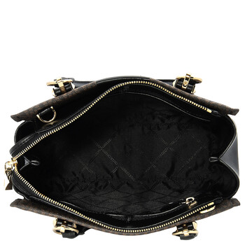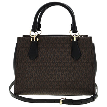 Michael Kors Ladies Satchel. SKU: 30H3G6AS2B292. Color: Brown. Size: 11.5” W X 8.5”H X 5.5” D. Michael Kors Marilyn Medium Logo Stripe Satchel - Red. Crafted from MK Signature-print canvas, this bag features contrasting stripes for a bold, graphic effect and a structured silhouette. It includes a main compartment with a zipper pocket, two small slip pockets on the front, and exterior back and front slip pockets. The bag has a zip fastening closure and offers an adjustable, detachable crossbody strap with a 21"-24" drop, along with double handles with a 4.5" drop for versatile carrying options.
