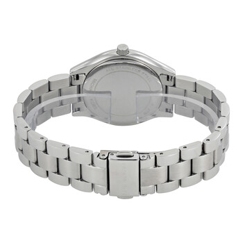 Stainless steel case with a stainless steel bracelet. Fixed rose gold-tone bezel. Silver dial with rose gold-tone hands and index hour markers. Dial Type: Analog. Quartz movement. Scratch resistant mineral crystal. Pull / push crown. Solid case back. Case size: 34 mm. Case thickness: 8 mm. Round case shape. Fold over clasp. Water resistant at 50 meters / 165 feet. Functions: hour, minute, second. Dress watch style. Michael Kors Mini Slim Runway Ladies Watch MK3514.