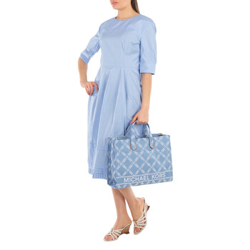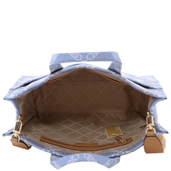 Michael Kors Ladies Tote. SKU: 30R4G3GT3U465. Color: Blue. Size: 15.5"W x 11.75"H x 5.25"D. Michael Kors Monogram-Jacquard Denim Tote Bag. This tote features an allover logo chain jacquard pattern with Empire logo jacquard detailing. It has a rectangular shape and a handle drop of 4.5 inches. The exterior includes a front slip pocket, while the interior boasts a back zip pocket and two front slip pockets. Silver-tone hardware complements the design. 53.2% Cotton/46.8% Polyester.