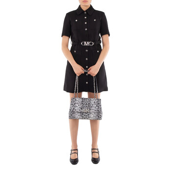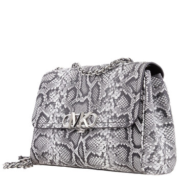 Michael Kors Ladies Shoulder Bag. SKU: 30H3S7PS3E001. Color: Black. Size: W:11.25" x H:7.75" x D:3.75". Michael Kors Snake Embossed Leather Shoulder Bag. This shoulder bag features a braided chain strap, a snake-embossed finish, bold Empire hardware on the front, and a back snap slip pocket, with interior details including a back zip pocket, front slip pockets, and a center zip compartment, all secured with a snap fastening. 100% leather, Lining: 100% polyester.