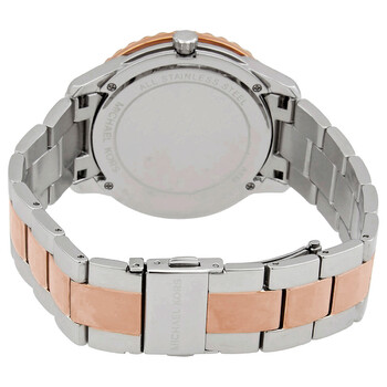 Stainless steel case with a two-tone (silver-tone and rose gold-tone) stainless steel bracelet. Fixed rose gold-tone bezel with an inlaid black ring. Black (crystal pave center) dial with luminous rose gold-tone hands and dots hour markers. Minute markers around the outer rim. Dial Type: Analog. Luminescent hands and markers. Quartz movement. Scratch resistant mineral crystal. Pull / push crown. Solid case back. Round case shape. Case size: 40 mm. Case thickness: 10 mm. Band width: 20 mm. Fold over clasp with a push button release. Water resistant at 50 meters / 165 feet. Functions: hour, minute, second. Runway Series. Casual watch style. Michael Kors Runway Quartz Black Dial Ladies Watch MK6960.