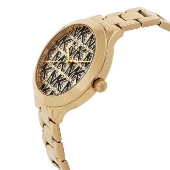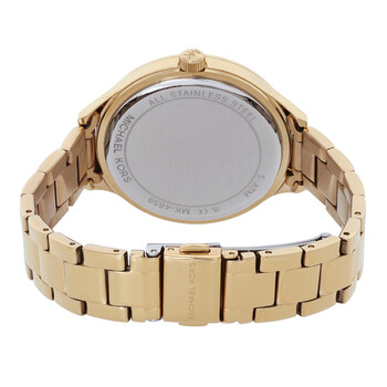 Gold-tone stainless steel case and bracelet. Fixed gold-tone stainless steel bezel. Gold-tone dial with gold-tone hands. Dial Type: Analog. Quartz movement. Scratch resistant mineral crystal. Pull / push crown. Solid case back. Round case shape, case size: 38 mm, case thickness: 12 mm. Band width: 16 mm. Deployment with push button release clasp. Water resistant at 50 meters / 165 feet. Functions: hour, minute, second. Slim Runaway Series. Casual watch style. Michael Kors Slim Runaway Quartz Gold Dial Ladies Watch MK4659.