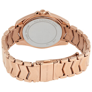 Rose gold-tone stainless steel case and bracelet. Fixed rose gold-tonebezel set with crystals. White dial with rose gold-tone hands and crystal-tipped index hour markers. Roman numerals appear at the 6 and 12 o'clock positions. Dial Type: Analog. Quartz movement. Scratch resistant mineral crystal. Pull / push crown. Solid case back. Round case shape. Case size: 38 mm. Case thickness: 7 mm. Band width: 18 mm. Fold over clasp with a push button release. Water resistant at 50 meters / 165 feet. Functions: hour, minute, second. Whitney Series. Casual watch style. Michael Kors Whitney Quartz Crystal White Dial Ladies Watch MK6694.