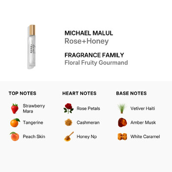 Launch year: 2022. Fragrance Family: Floral Fruity Gourmand. Top notes: Strawberry mara, Tangerine, Peach skin. Heart notes: Rose petals, Cashmeran, Honey NP. Base notes: Vetiver Haiti, Amber Musk, White Caramel. Design house: Michael Malul. Design house category: niche fragrance brand. Design house country: United States. Scent name: Rose+Honey. Gender: Ladies. Category: Fragrance. Collection: "+" Range. SubType: EDP Spray. Size: 0.34 oz. SKU: 00850067815525. Barcode: 850067815525. Michael Malul Ladies Rose+Honey EDP Spray 0.34 oz Fragrances 850067815525.