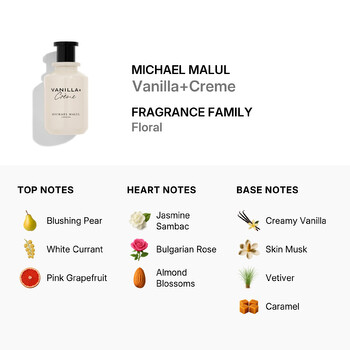 The base notes of Creamy Vanilla, Skin Musk, Vetiver, and Caramel create a warm and inviting finish that lingers on the skin. This rich combination of scents offers a comforting embrace, leaving a lasting impression wherever you go. Michael Malul's Vanilla+Crème is a testament to the brand's commitment to quality and craftsmanship, making it a must-have addition to any fragrance collection.