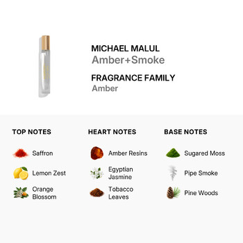 Launch year: 2022. Fragrance Family: Amber. Top notes: Saffron, Lemon Zest, Orange Blossom. Heart notes: Amber Resins, Egyptian Jasmine, Tobacco Leaves. Base notes: Sugared Moss, Pipe Smoke, Pine Woods. Design house: Michael Malul. Design house category: niche fragrance brand. Design house country: United States. Scent name: Amber+Smoke. Gender: Mens. Category: Fragrance. Collection: "+" Range. SubType: EDP Spray. Size: 0.34 oz. SKU: 00850067815518. Barcode: 850067815518. Michael Malul Men's Amber+Smoke EDP Spray 0.34 oz Fragrances 850067815518.