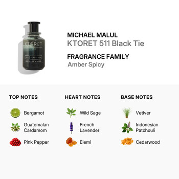 Part of the Amber Spicy fragrance family, KTORET 511 Black Tie opens with a bold blend of bergamot, Guatemalan cardamom, and pink pepper, delivering an instant spark of freshness with a spicy twist. At its heart, wild sage, French lavender, and elemi resin create a smooth and aromatic center that’s both calming and intriguing. The base settles into rich notes of vetiver, Indonesian patchouli, and cedarwood, leaving behind a warm, earthy trail that lingers throughout the day.