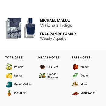 Part of the Woody Aquatic fragrance family, Visionair Indigo opens with an invigorating splash of pomelo, lemon, ocean waters, pineapple, and pear. These bright and juicy top notes create an energizing first impression that feels like a breath of fresh air. As the scent settles, heart notes of tea leaf and orange blossom bring a refined, subtle warmth that adds depth and complexity. Finally, the base unfolds into a rich, masculine blend of amber, cedar, musk, and sandalwood—leaving a lasting impression that’s both smooth and unforgettable.