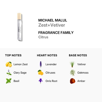 Launch year: 2024. Fragrance Family: Citrus. Top notes: Lemon zest, Clary sage, Basil. Heart notes: Lavender, Citruses, Orris root. Base notes: Vetiver, Oakmoss, Amber. Design house: Michael Malul. Design house category: niche fragrance brand. Design house country: United States. Scent name: Zest+Vetiver. Gender: Mens. Category: Fragrance. Collection: "+" Range. SubType: EDP Spray. Size: 0.34 oz. SKU: 00850067815600. Barcode: 850067815600. Michael Malul Men's Zest+Vetiver EDP Spray 0.34 oz Fragrances 850067815600.