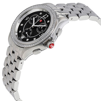 Stainless steel case with a stainless steel bracelet. Fixed stainless steel diamond pave bezel. Black textured dial with luminous silver-tone hands and diamond hour markers. Arabic numerals mark the 3, 9 and 12 o'clock positions. Dial Type: Analog. Luminescent hands. Date display at the 6 o'clock position. Chronograph - two sub-dials displaying: 60 second and 30 minute. Day of the week sub-dial. Quartz movement. Scratch resistant sapphire crystal. Red cabochon crown. Solid case back. Case size: 37 mm. Round case shape. Band width: 18 mm. Deployment clasp. Water resistant at 50 meters / 165 feet. Functions: chronograph, date, hour, minute, second. Additional Info: the bracelet is interchangeable with any 18mm michele strap. Dress watch style. Watch label: Swiss Made. Michele Belmore Chronograph Ladies Watch MWW29B000004.