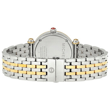 Stainless steel case with a two-tone (silver and gold PVD) stainless steel bracelet. Fixed gold PVD bezel set with 140 diamonds (0.58 ct). Mother of pearl dial with gold-tone hands and alternating stick and Roman numeral hour markers. Minute markers around the outer rim. Dial Type: Analog. Luminescent hands. Small seconds sub-dial at the 6 o'clock position. Swiss quartz movement. Scratch resistant sapphire crystal. Pull / push crown. Solid case back. Case diameter: 37 mm. Round case shape. Band width: 18 mm. Deployment clasp. Water resistant at 50 meters / 165 feet. Functions: hour, minute, second. Dress watch style. Michele Caber Diamond Mother of Pearl Dial Two-Tone Ladies Watch MWW16A000066.