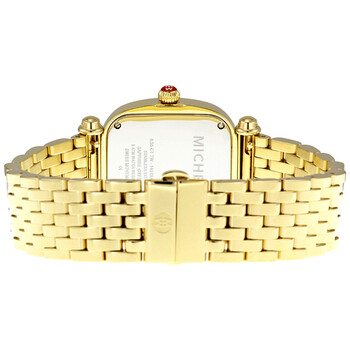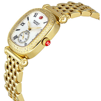 Gold plated stainless steel case with a gold plated stainless steel bracelet. Fixed bezel. Mother of pearl dial with gold-tone hands and alternating Roman numeral and index hour markers. Minute markers around the outer rim. Dial Type: Analog. Luminescent hands and markers. Small seconds sub-dial. Quartz movement. Scratch resistant sapphire crystal. Screw down crown. Solid case back. Case diameter: 46 mm x 32 mm. Band width: 18 mm. Deployment with push button clasp. Water resistant at 50 meters / 165 feet. Functions: hour, minute, second. Casual watch style. Watch label: Swiss Made. Michele Caber Isle Mother of Pearl Dial Gold Plated Stainless Steel Ladies Watch MWW16C000008.
