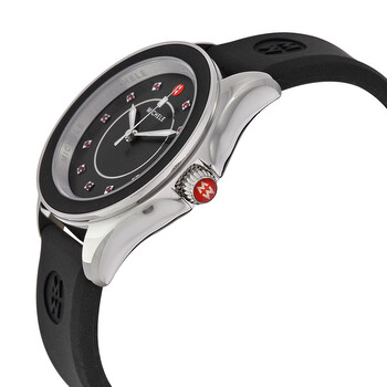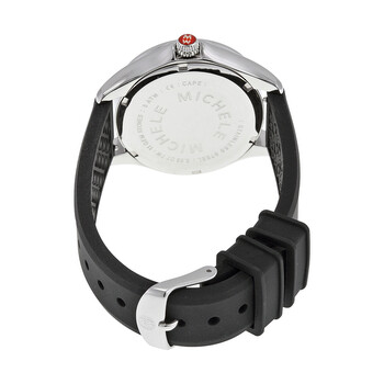 Stainless steel case with a black silicone strap. Fixed stainless steel bezel with a black top ring. Black sunray dial with silver-tone hands and red topaz hour markers. Dial Type: Analog. Quartz movement. Scratch resistant mineral crystal. Solid case back. Case diameter: 40 mm. Round case shape. Band width: 18 mm. Tang clasp. Water resistant at 50 meters / 165 feet. Functions: hour, minute, second. Additional Info: interchangeable with any Michele 18mm strap. Dress watch style. Michele Cape Black Dial Black Silicone Ladies Ladies Watch MWW27A000006.