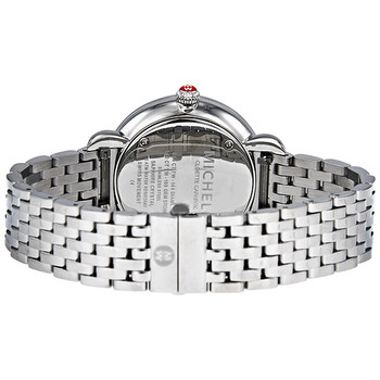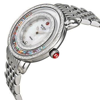 Stainless steel case with a stainless steel bracelet. Fixed silver-tone bezel set with two rows of diamonds. 144 diamonds total (0.64 ctw). Mother of pearl dial with floating multi-colored topaz jewels, silver-tone hands and dot hour markers. Dial Type: Analog. Swiss quartz movement. Scratch resistant sapphire crystal. Solid case back. Case diameter: 38 mm. Round case shape. Band width: 16 mm. Deployment clasp with push button. Water resistant at 50 meters / 165 feet. Functions: hour, minute, second. Dress watch style. Michele Cloette Carnival Diamond and Topaz Mother of Pearl Ladies Watch MWW20G000001.