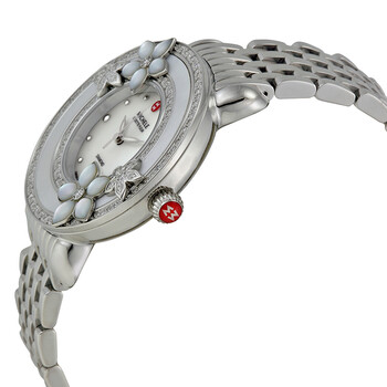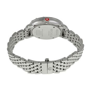 Stainless steel case with a stainless steel bracelet. Fixed stainless steel set with diamonds bezel. Mother of pearl dial with silver-tone hands and diamond hour markers. Dial Type: Analog. Luminescent hands and markers. Quartz movement. Scratch resistant sapphire crystal. Solid case back. Case diameter: 38 mm. Round case shape. Deployment with push button clasp. Water resistant at 50 meters / 165 feet. Functions: hour, minute, second. Dress watch style. Watch label: Swiss Made. Michele Cloette Mother of Pearl Dial Stainless Steel Ladies Watch MWW20A000001.