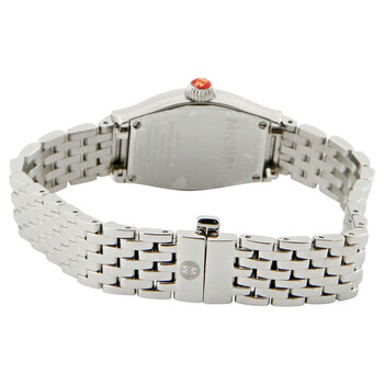 Stainless steel case with a stainless steel bracelet. Fixed satinless steel bezel set with 80 white diamonds (~0.50 ct.). Textured white enamel dial with black hands and black Arabic numeral hour markers. Seconds sub-dial at the 6 o'clock position. Battery operated Swiss quartz movement. Scratch resistant sapphire crystal. Solid case back. Case dimensions: 22.5 mm x 33.65 mm. Case thickness 8 mm. Deployment clasp with push button release. Water resistant at 30 meters / 100 feet. Functions: hours, minutes, small seconds. AdditionalInfo: set with 80 white diamonds (~0.50 ct.). Michele Coquette Petite Diamond Ladies Watch MWW08A000186.