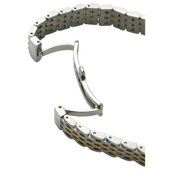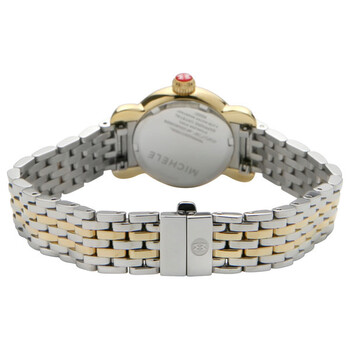 Polished Gold Tone with Steel Case & Bracelet. White mother of pearl dial. 84 Diamonds set on bezel. Scratch Resistant Sapphire Crystal. Case diameter: 26mm. Water resistant 30m/100ft.
