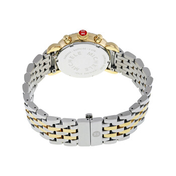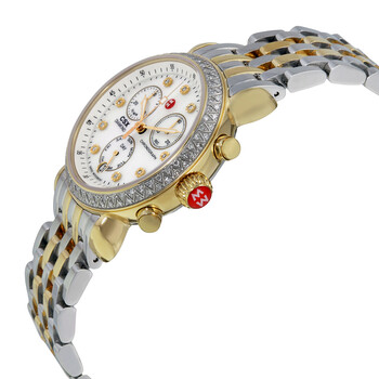 Stainless steel case with a two-tone (silver and gold-tone) stainless steel bracelet. Fixed stainless steel bezel set with diamonds. Mother of pearl dial with luminous gold-tone hands and diamond hour markers. Minute markers around the outer rim. Dial Type: Analog. Luminescent hands. Date display appears at the 6 o'clock position. Chronograph - two sub-dials displaying: 60 second and 30 minute. Day of the week sub-dial at the 6 o'clock position. Quartz movement. Scratch resistant sapphire crystal. Pull / push crown. Solid case back. Case diameter: 36 mm. Case thickness: 10 mm. Round case shape. Band width: 18 mm. Double folding clasp. Water resistant at 50 meters / 165 feet. Functions: hours, minutes, seconds, date, chronograph. Additional Info: suitable for swimming and showering. Dress watch style. Watch label: Swiss Movement. Michele CSX 36 Mother of Pearl Diamond Dial Two-tone Ladies Watch MWW03M000158.