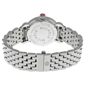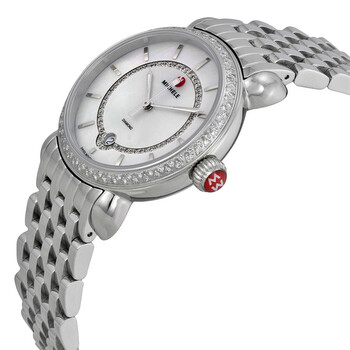 Stainless steel case with a stainless steel bracelet. Fixed stainless steel bezel set with diamonds. White mother of pearl dial set with diamonds with silver-tone hands and index hour markers. Dial Type: Analog. Date display at the 6 o'clock position. Quartz movement. Scratch resistant sapphire crystal. Solid case back. Case diameter: 36 mm. Round case shape. Band width: 18 mm. Band length: 6 inches. Water resistant at 50 meters / 165 feet. Functions: date, hour, minute, second. Dress watch style. Michele CSX Elegance Stainless Steel Ladies Watch MWW03T000035.