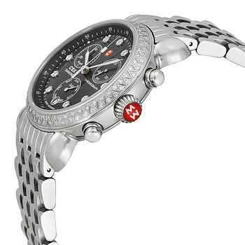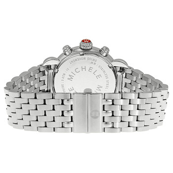 Stainless steel case with a stainless steel bracelet. Fixed silver-tone set with diamonds bezel. Black mother of pearl dial with silver-tone hands and diamond hour markers. Minute markers around the outer rim. Dial Type: Analog. Date display at the 6 o'clock position. Chronograph - two sub-dials displaying: 60 second and 30 minute. day of the week sub-dial at the 6 o'clock position. Quartz movement. Scratch resistant sapphire crystal. Solid case back. Case diameter: 36 mm. Round case shape. Deployment clasp. Water resistant at 50 meters / 165 feet. Functions: chronograph, date, hour, minute, second. Casual watch style. Watch label: Swiss Movement. Michele CSX Signature Black Mother of Pearl Stainless Steel Ladies Watch MWW03M000192.