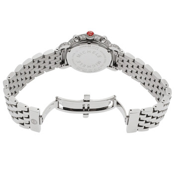 Stainless steel case with a stainless steel bracelet set with diamonds. Fixed stainless steel bezel set with diamonds. Diamond pave dial with skeleton hands. Dial Type: Analog. Date display at the 6 o'clock position. Chronograph - three sub-dials displaying: 60 second, 30 minute and 1/10th of a second. Quartz movement. Scratch resistant sapphire crystal. Pull / push crown. Solid case back. Case diameter: 36 mm. Round case shape. Band width: 18 mm. Deployment clasp. Water resistant at 50 meters / 165 feet. Functions: chronograph, date, hour, minute, second. Dress watch style. Michele CSX-36 Ultimate Chronograph Pave Diamond Dial Stainless Steel Ladies Watch MWW03C000504.