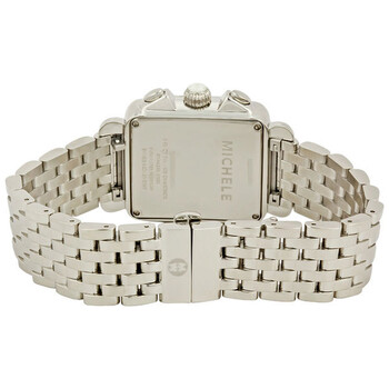 Stainless steel case with a stainless steel link bracelet. Fixed bezel set with 108 diamonds (0.60 carats). White enamel dial with luminous hands and stick hour markers. Minute markers around the outer rim. Date displays at the 6 o'clock position. Three: 1/10th second, 30 minutes, 60 seconds sub dials. Quartz movement. Scratch resistant sapphire crystal. Case dimensions: 33mm x 46mm. Deployment clasp. Water resistant at 50 meters/165 feet. Functions: hours, minutes, seconds, chronograph.