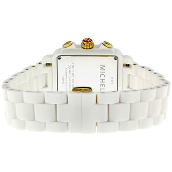 White ceramic case with a white ceramic bracelet. Fixed gold-tone bezel set with 108 diamonds. White dial with luminous gold-tone hands and silver-tone hour markers, minute markers on the outer rim hour markers. Minute markers around the outer rim. Luminescent hands and dial markers. Date displays at the 6 o'clock position. Chronograph - three sub-dials displaying: 60 seconds, 30 minutes and 1/10th of a second. Quartz movement. Scratch resistant mineral crystal. Case dimensions: 33 mm x 46 mm. Case thickness: 11 mm. Deployment clasp. Water resistant at 50 meters/ 165 feet. Functions: hours, minutes, seconds, date, chronograph. Michele Deco Ceramic Diamond Watch MWW06F000003.
