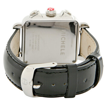 Stainless steel case with a black leather bracelet. Fixed stainless steel bezel. White mother of pearl dial with silver-tone hands and stick hour markers. Minute markers around trhe outer rim. Date display at the 6 o'clock position. Chronograph - three sub-dials displaying: 60 seconds, 30 minutes and 1/10th of a seconds. Battery operated quartz movement. Scratch resistant sapphire crystal. Push in crown. Screw down stainless steel case back. Case dimensions: 33 mm x 46 mm. Tang clasp. Water resistant at 50 meters / 165 feet. Michele Deco Chronograph Black Leather Ladies Watch MWW06A000125.