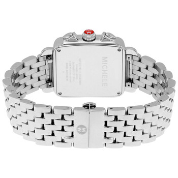 Stainless steel case with a stainless steel bracelet. Fixed stainless steel bezel. Blue mother of pearl dial with silver-tone hands and diamond-set index hour markers. Minute markers around the outer rim. Dial Type: Analog. Luminescent hands and markers. Date display at the 6 o'clock position. Chronograph - two sub-dials displaying: 60 second and 30 minute. Day of the week sub-dial appears at the 6 o'clock position. Quartz movement. Scratch resistant sapphire crystal. Solid case back. Case dimensions: 33 mm x 35 mm. Square case shape. Band width: 18 mm. Water resistant at 30 meters / 100 feet. Functions: chronograph, day, date, hour, minute, second. Additional Info: number of diamonds: 12, total diamond weight: 0.05 ct.. Luxury watch style. Watch label: Swiss Made. Michele Deco Chronograph Blue Mother of Pearl with .05 ct. Diamond Dial Stainless Steel Bracelet Ladies Watch MWW06P000172.