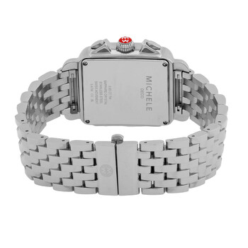 Silver-tone stainless steel case and bracelet. Fixed silver-tone bezel with diamond set. Purple dial with luminous hands and diamond hour markers. Minute markers around the outer rim. Dial Type: Analog. Luminescent hands and markers. Date display at the 6 o'clock position. Chronograph - three sub-dials displaying: 60 second, 30 minute and 1/10th of a second. Quartz movement. Scratch resistant sapphire crystal. Pull / push crown. Solid case back. Rectangle case shape, case size: 33 mm. Band width: 18 mm. Bracelet butterfly deployant clasp. Water resistant at 50 meters / 165 feet. Functions: central 60 second hand,chronograph,date,small second hand. Deco Series. Dress watch style. Watch label: Swiss Made. Michele Deco Chronograph Quartz Diamond Purple Dial Ladies Watch MWW06A000800.