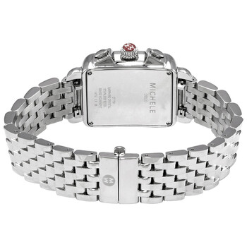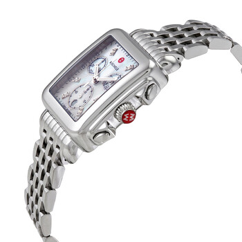 Silver-tone stainless steel case and bracelet. Fixed bezel. White mother of pearl dial with silver-tone hands and diamonds hour markers. Dial Type: Analog. Date display at the 6 o'clock position. Chronograph - three sub-dials displaying: 60 second, 30 minute and 1/10th of a second. Quartz movement. Scratch resistant sapphire crystal. Solid case back. Rectangle case shape, case size: 33 mm x 35 mm. Band width: 18 mm. Butterfly deployant clasp. Water resistant at 50 meters / 165 feet. Functions: chronograph, date, hour, minute, second. Additional Info: dial set with 12 diamonds (0.04 ct). Deco Series. Dress watch style. Michele Deco Chronograph Quartz Diamond White Mother of Pearl Dial Ladies Watch MWW06A000778.