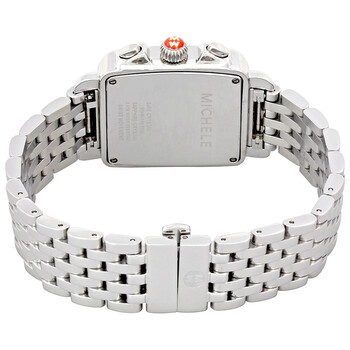 Stainless steel case with a stainless steel bracelet. Fixed stainless steel bezel setwith diamonds. Mother of pearl dial with luminous silver-tone hands and index hour markers. Minute markers around the outer rim. Dial Type: Analog. Luminescent hands and markers. Date display at the 6 o'clock position. Chronograph - two sub-dials displaying: 60 second and 30 minute. Day of the week sub-dial at the 6 o'clock position. Quartz movement. Scratch resistant sapphire crystal. Solid case back. Case dimensions: 33 mm x 35 mm. Case thickness: 11 mm. Rectangle case shape. Band width: 18 mm. Hidden deployment clasp. Water resistant at 50 meters / 165 feet. Functions: hours, minutes, seconds and date. Additional Info: 0.66 ct total diamond weight. Luxury watch style. Watch label: Swiss Movement. Michele Deco Day Mother of Pearl Dial Diamond Ladies Watch MWW06P000099.
