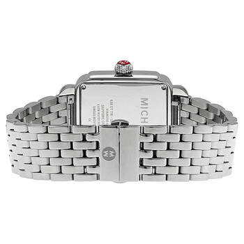 Stainless steel case with a stainless steel bracelet. Fixed stainless steel bezel set with diamonds (126 diamonds total, 0.68 ctw). Mother of pearl mosaic dial with silver-tone hands and diamond hour markers. Dial Type: Analog. Luminescent hands. Date display at the 6 o'clock position. Swiss quartz movement. Scratch resistant sapphire crystal. Pull / push crown. Solid case back. Case dimensions: 33 mm x 35 mm. Rectangle case shape. Band width: 18 mm. Deployment clasp with push button. Water resistant at 50 meters / 165 feet. Functions: date, hour, minute, second. Dress watch style. Michele Deco Diamond Geometric Mosaic Ladies Watch MWW06T000069.
