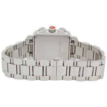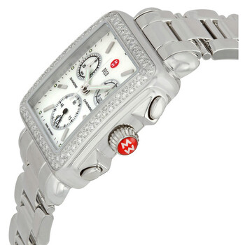 Stainless steel case and link bracelet. Fixed stainless steel bezel set with 108 diamonds (0.60 carats). Mother of pearl dial with luminous hands and stick hour markers. Minute markers around the outer rim. Date display at the 6 o'clock position. Chronograph - three sub-dials displaying: 60 seconds, 30 minutes and 1/10th of a second. Scratch resistant mineral crystal. Battery operated Swiss quartz movement. Solid case back. Case dimensions: 33 mm x 46 mm. Case thickness: 11 mm. Hidden folding clasp. Water resistant to 50 meters / 165 feet. Michele Deco Diamond Ladies Watch MWW06A000448.