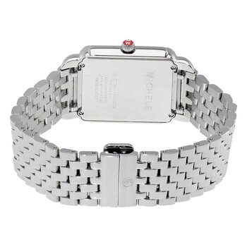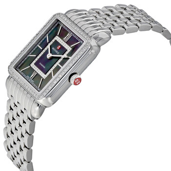 Stainless steel case with a stainless steel bracelet. Fixed stainless steel bezel set with diamonds. Black mother of pearl diamond-set dial with silver-tone hands and index hour markers. Roman numerals mark the 6 and 12 o'clock positions. Dial Type: Analog. Quartz movement. Scratch resistant sapphire crystal. Solid case back. Case dimensions: 30 mm x 32 mm. Rectangle case shape. Band length: 6 inches. Deployment clasp. Water resistant at 50 meters / 165 feet. Casual watch style. Michele Deco II Black Mother of Pearl Dial Stainless Steel Ladies Watch MWW06X000011.