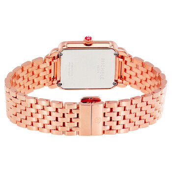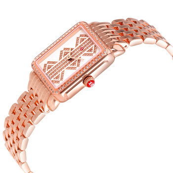 Rose gold-tone stainless steel case with a rose gold-tone stainless steel bracelet. Fixed bezel. Geometric diamond-set dial with rose gold-tone hands. Dial Type: Analog. Quartz movement. Scratch resistant sapphire crystal. Solid case back. Case size: 26.5 mm x 29 mm. Rectangle case shape. Band width: 16 mm. Water resistant at 50 meters / 165 feet. Functions: hour, minute, second. Additional Info: total number of diamonds: 183. total diamond weight:. Dress watch style. Michele Deco II Mid Rose Gold-Tone Ladies Watch MWW06I000021.