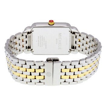 Stainless steel case with a two-tone (silver and gold-plated) stainless steel bracelet. Fixed silver and gold-plated bezel set with diamonds ( 0.51 carats). Mother of pearl diamond-set dial with gold-tone hands and index hour markers. Roman numerals mark the 6 and 12 o'clock positions. Minute markers around the outer rim. Dial Type: Analog. Quartz movement. Scratch resistant sapphire crystal. Pull / push crown. Solid case back. Case dimensions: 30 mm x 32 mm. Case thickness: 7 mm. Rectangle case shape. Band width: 18 mm. Fold over clasp with push button release Water resistant at 50 meters / 165 feet. Functions: hour, minute. Additional Info: 18 mm. Dress watch style. Watch label: Swiss Made. Michele Deco II Mother of Pearl Dial Two-tone Stainless Steel Quartz Ladies Watch MWW06X000006.