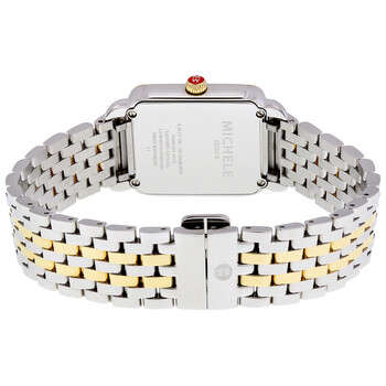 Stainless steel case with a two-tone (silver-tone and gold-plated) stainless steel bracelet. Fixed gold-plated bezel set with diamonds. Mother of pearl diamond-set dial with gold-tone hands and index hour markers. Roman numerals mark the 6 and 12 o'clock positions. Minute markers around the outer rim. Dial Type: Analog. Luminescent hands. Quartz movement. Scratch resistant sapphire crystal. Red cabochon crown. Solid case back. Rectangle case shape. Case dimensions: 27.5 mm x 26 mm. Case thickness: 7 mm. Band width: 16 mm. Hidden fold over clasp. Water resistant at 50 meters / 165 feet. Functions: hour, minute, second. Additional Info: in general, suitable for short periods of recreational swimming, but not diving or snorkeling. Deco II Series. Dress watch style. Watch label: Swiss Movt. Michele Deco II Mother of Pearl Diamond Dial Ladies Watch MWW06I000004.