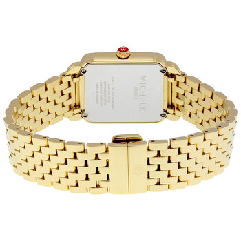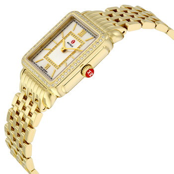 Gold-plated stainless steel case with and bracelet. Fixed gold-plated bezel set with diamonds. Mother of pearl diamond-set dial with gold-tone hands and index hour markers. Roman numerals mark the 6 and 12 o'clock positions. Minute markers around the outer rim. Dial Type: Analog. Luminescent hands. Quartz movement. Scratch resistant sapphire crystal. Red cabochon crown. Solid case back. Case dimensions: 26 mm x 27.5 mm. Rectangle case shape. Band width: 16 mm. Hidden fold over clasp. Water resistant at 50 meters / 165 feet. Functions: hour, minute, second. Dress watch style. Michele Deco II Mother of Pearl Diamond Dial Ladies Watch MWW06I000007.