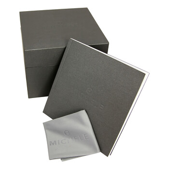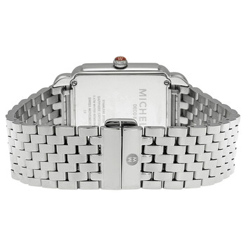 Stainless steel case with a stainless steel bracelet. Fixed silver-tone bezel set with diamonds. White mother of pearl diamond-set dial with silver-tone hands and index hour markers. Roman numerals mark the 6 and 12 o'clock positions. Minute markers around the outer rim. Dial Type: Analog. Quartz movement. Scratch resistant sapphire crystal. Solid case back. Case dimensions: 30 mm x 32 mm. Round case shape. Band width: 18 mm. Deployment clasp. Water resistant at 50 meters / 165 feet. Functions: hour, minute. Luxury watch style. Watch label: Swiss Made. Michele Deco II Mother of Pearl Diamond Stainless Steel Ladies Watch MWW06X000001.