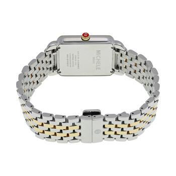 Stainless steel case with a two-tone (silver and yellow gold-plated) stainless steel bracelet. Fixed yellow gold-plated bezel. Mother of pearl diamond-set dial with gold-tone hands and index hour markers. Roman numerals mark the 6 and 12 o'clock position. Minute markers around the outer rim. Dial Type: Analog. Quartz movement. Scratch resistant sapphire crystal. Solid case back. Case dimensions: 30 mm x 32 mm. Rectangle case shape. Band width: 18 mm. Water resistant at 50 meters / 165 feet. Functions: hour, minute. Additional Info: interchangeable with any 18mm michele deco ii strap. Dress watch style. Watch label: Swiss Made. Michele Deco II Watch MWW06X000017.