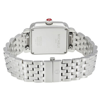 Silver-tone stainless steel case with a silver-tone stainless steel bracelet. Fixed silver-tone stainless steel bezel. Cobalt sunray dial with silver-tone hands and Roman numeral hour markers. Dial Type: Analog. Date display at the 6 o'clock position. Quartz movement. Scratch resistant sapphire crystal. Solid case back. Case size: 33 mm x 35 mm. Rectangle case shape. Deployment clasp. Water resistant at 50 meters / 165 feet. Functions: date, hour, minute, second. Dress watch style. Watch label: Swiss Made. Michele Deco Madison Cobalt Dial Diamond Ladies Watch MWW06T000154.