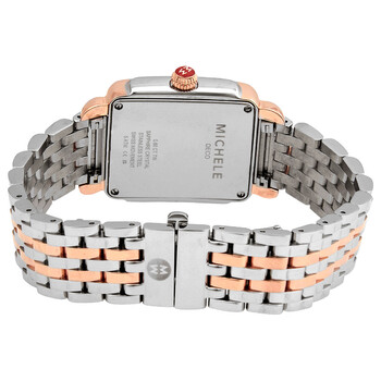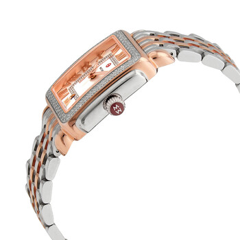 Stainless steel case with a two-tone (silver-tone and 18kt pink gold-plated) stainless steel bracelet. Fixed rose gold-tone bezel set with diamonds. Silver white sunray (diamond-set) dial with rose gold-tone skeleton hands and Roman numeral hour markers. Dial Type: Analog. Date display at the 6 o'clock position. Quartz movement. Scratch resistant sapphire crystal. Pull / push crown. Solid case back. Square case shape. Case size: 31 mm. Band width: 16 mm. Deployment clasp. Water resistant at 50 meters / 165 feet. Functions: date, hour, minute, second. Additional Info: bezel set with 148 diamonds (0.6000 cts). Deco Madison Mid Series. Dress watch style. Watch label: Swiss Made. Michele Deco Madison Mid Quartz Diamond Ladies Watch MWW06G000015.
