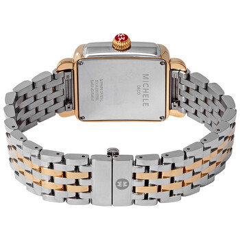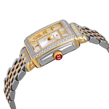 Gold-plated and silver-plated stainless steel case with a two-tone (silver-tone and gold-plate) stainless steel bracelet. Fixed gold-plated bezel set with diamonds. Silver sunray (diamond-set) dial with gold-tone hands and Roman numeral hour markers. Dial Type: Analog. Date display at the 6 o'clock position. Quartz movement. Scratch resistant sapphire crystal. Pull / push crown. Solid case back. Rectangle case shape. Case dimensions: 33 mm x 35 mm. Case thickness: 11 mm. Band width: 18 mm. Fold over clasp with a push button release. Water resistant at 50 meters / 165 feet. Functions: date, hour, minute, second. Deco Madison Series. Dress watch style. Watch label: Swiss Made. Michele Deco Madison Silver Sunray Dial Ladies Two Tone Watch MWW06T000144.