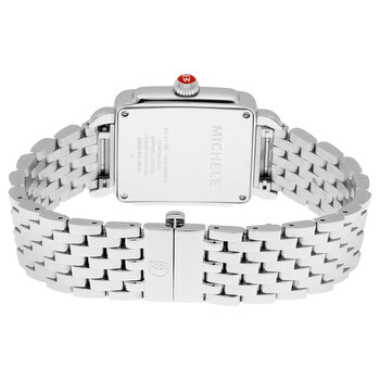 Silver-tone stainless steel case with a silver-tone stainless steel bracelet. Fixed silver-tone 126 diamonds (0.57 ct) bezel. Metallic rose gold dial with luminous silver-tone hands and diamond index hour markers. Minute markers around the outer rim. Dial Type: Analog. Luminescent hands and markers. Seconds sub-dial at the 6 o'clock position subdials. Quartz movement. Scratch resistant sapphire crystal. Solid case back. Square case shape, case size: 31 mm x 29 mm. Band width: 18 mm. Deployment clasp. Water resistant at 50 meters / 165 feet. Functions: hour, minute, second. Deco Series. Dress watch style. Watch label: Swiss Made. Michele Deco Metallic Rose Gold Dial Ladies Watch MWW06V000079.