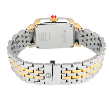 Silver-tone stainless steel case with a two-tone (silver-tone and yellow gold-tone) stainless steel bracelet. Fixed yellow gold-tone bezel with diamond set stainless steel. Blue dial with yellow gold-tone hands and diamond hour markers. Minute markers around the outer rim. Dial Type: Analog. Luminescent hands and markers. Quartz movement. Scratch resistant sapphire crystal. Rectangle case shape, case size: 29 mm. Band width: 16 mm. Fold over clasp with a safety release. Functions: hour, minute, second. Deco Mid Series. Casual watch style. Watch label: Swiss Made. Michele Deco Mid Quartz Diamond Blue Dial Ladies Watch MWW06V000125.