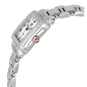Stainless steel case with a stainless steel bracelet set with diamonds. Stainless steel bezel set with diamonds. Mother of pearl dial with silver-tone hands and Arabic numeral hour markers. Minute markers around the outer rim. Quartz movement. Scratch resistant sapphire crystal. Push / pull steel crown with Michele logo. Screw in solid case back. Case dimensions: 23 mm x 24 mm. Case thickness: 7 mm. Deployment clasp. Water resistant at 50 meters (165 feet). Functions: hours, minutes, seconds. Additional Info: . The stainless steel bracelet is inter-changeable with any 12mm michele bracelet. Michele Deco Mini Diamond Watch MWW06D000049.