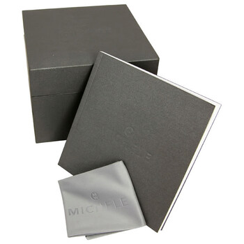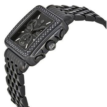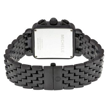 Black ion-plated stainless steel case and bracelet. Fixed black ion-plated bezel set with 108 black diamonds. Black enamel dial with black hands and stick hour markers. Minute markers around the outer rim. Dial Type: Analog. Luminescent hands and markers. Date display at the 6 o'clock position. Chronograph - three sub-dials displaying: 60 seconds, 30 minutes and 1/10th of a second. Quartz movement. Scratch resistant mineral crystal. Solid case back. Case dimensions: 33 mm x 46 mm. Case thickness: 10.6 mm. Rectangle case shape. Band width: 20 mm. Band length: ladies standard. Deployment clasp. Water resistant at 50 meters / 165 feet. Functions: hours, minutes, seconds, date, chronograph. Dress watch style. Watch label: Swiss Movement. Michele Deco Noir Diamond Black Ion-plated Ladies Watch MWW06A000679.